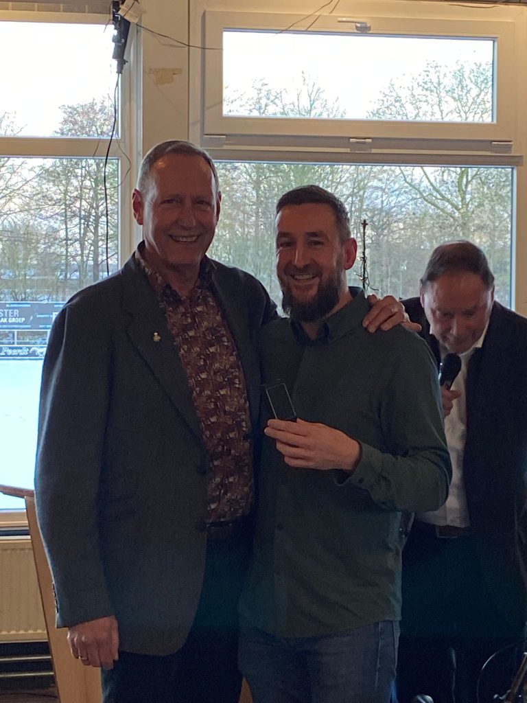 Voor Jordi Fok, de eerste die naar voren mocht komen om zijn speldje en bos bloemen op te komen halen, was het eigenlijk al zijn 28e jaar bij EBOH. Omdat hij pas recent terug is bij EBOH en daarvoor rond de nieuwjaarsreceptie (mede door verplichtingen bij zijn toenmalige club Oranje Wit) niet beschikbaar was, werd hij zaterdag gehuldigd. Familiegetrouw begon Jordi al vroeg met voetballen, uiteraard bij de Rood-Zwarte club aan de Schenkeldijk. Hij doorliep de jeugdelftallen en vertrok op zijn 16e naar FC Dordrecht. Omdat het voetballen toch moeilijk te combineren bleek met zijn studie zette hij na anderhalf jaar een punt achter dat avontuur en keerde uiteindelijk terug bij EBOH, om daar onder leiding van vader Ries Fok en René Ebbers in 2018 kampioen te worden in de 3e klasse C. Tegenwoordig is hij actief in de TC, waar hij de jeugd op zich neemt. Recent is hij vader geworden van dochter Beau; wellicht staat ook zij binnenkort in een Rood-Zwart tenue te voetballen.